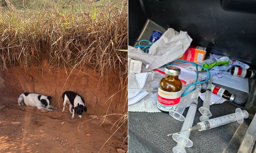 Quando foi flagrado, os suspeitos estavam uniformizados e usando uma viatura oficial, informou a Polícia Civil. Eles estavam colocando os cachorros no automóvel. Foram encontrados com o grupo seringas e frascos de sedativos